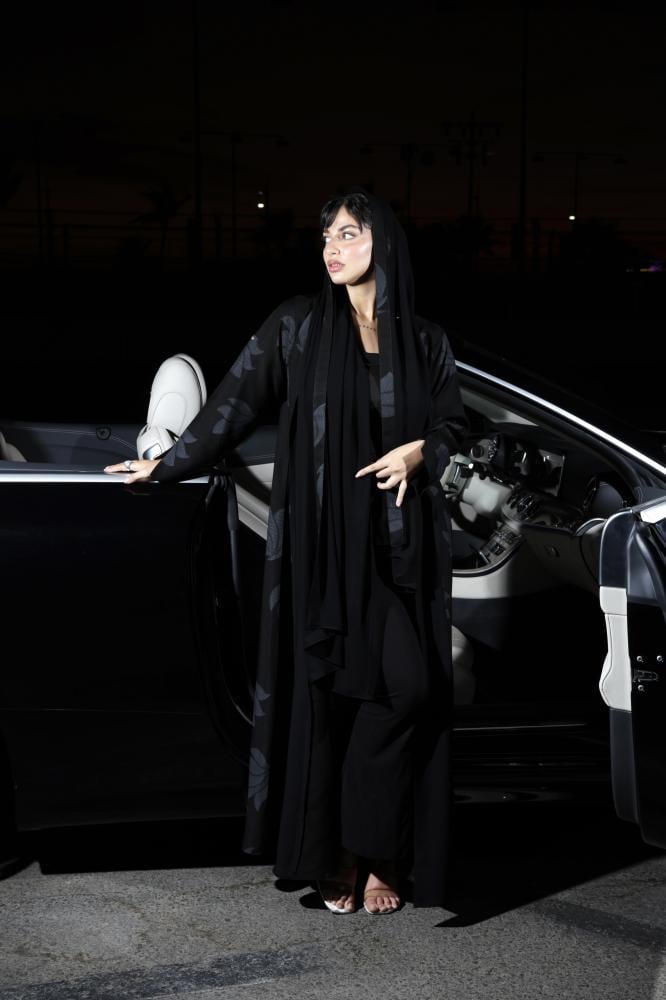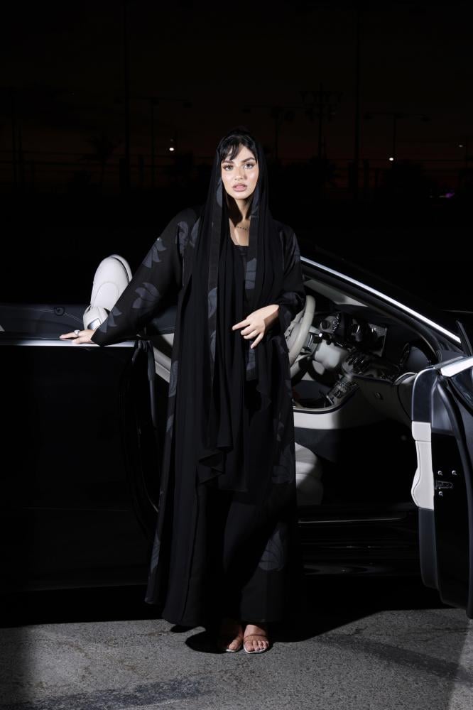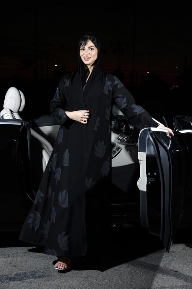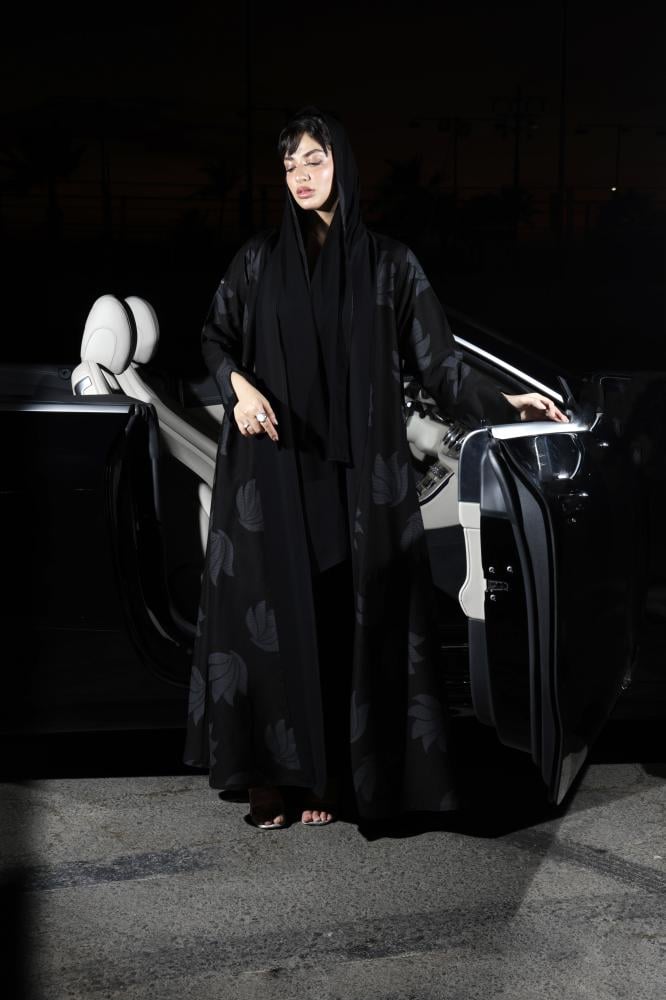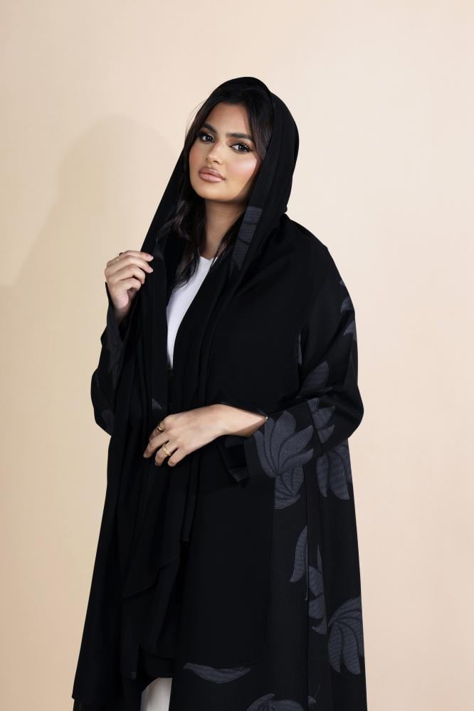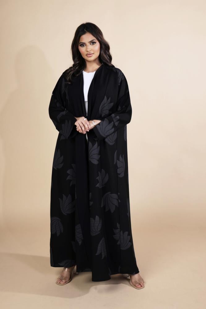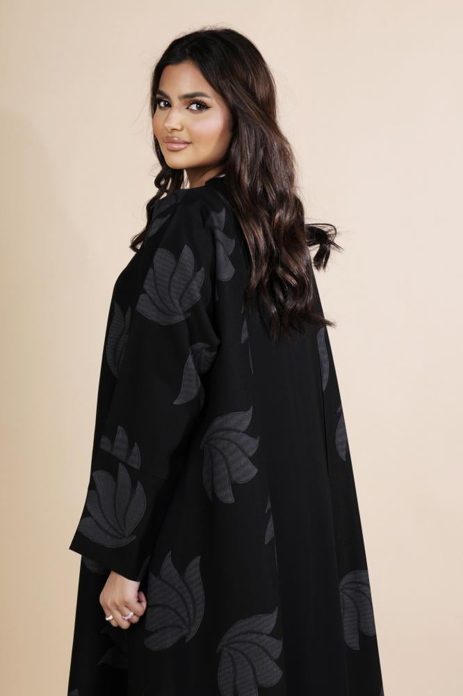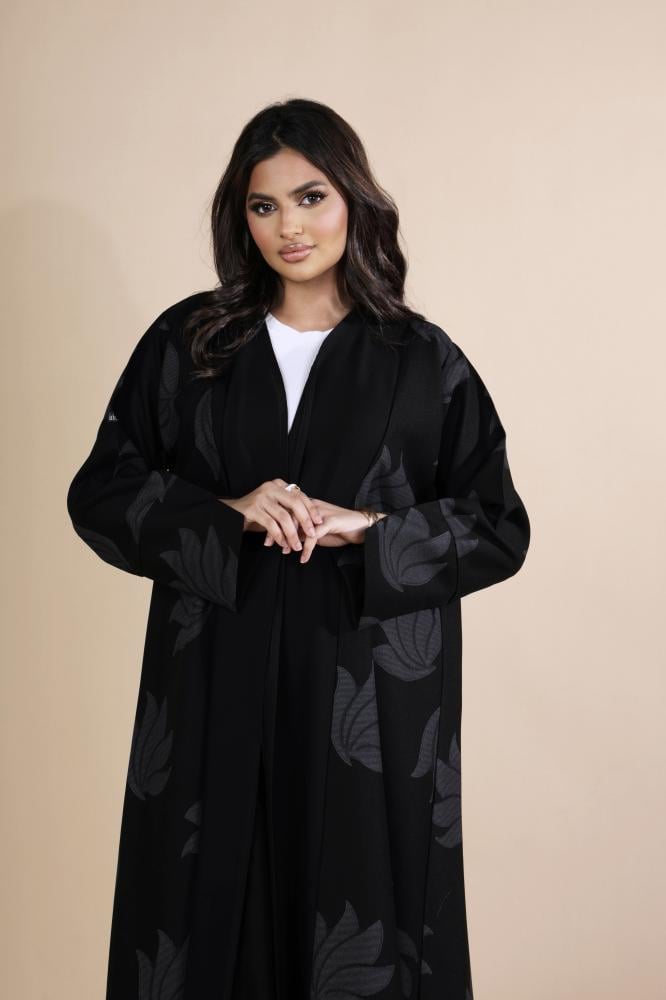 عباية سوداء كلاسيكية بنقوش موردة، مثالية للدوام والمناسبات الرسمية. أنيقة وفريدة لإطلالة راقية!